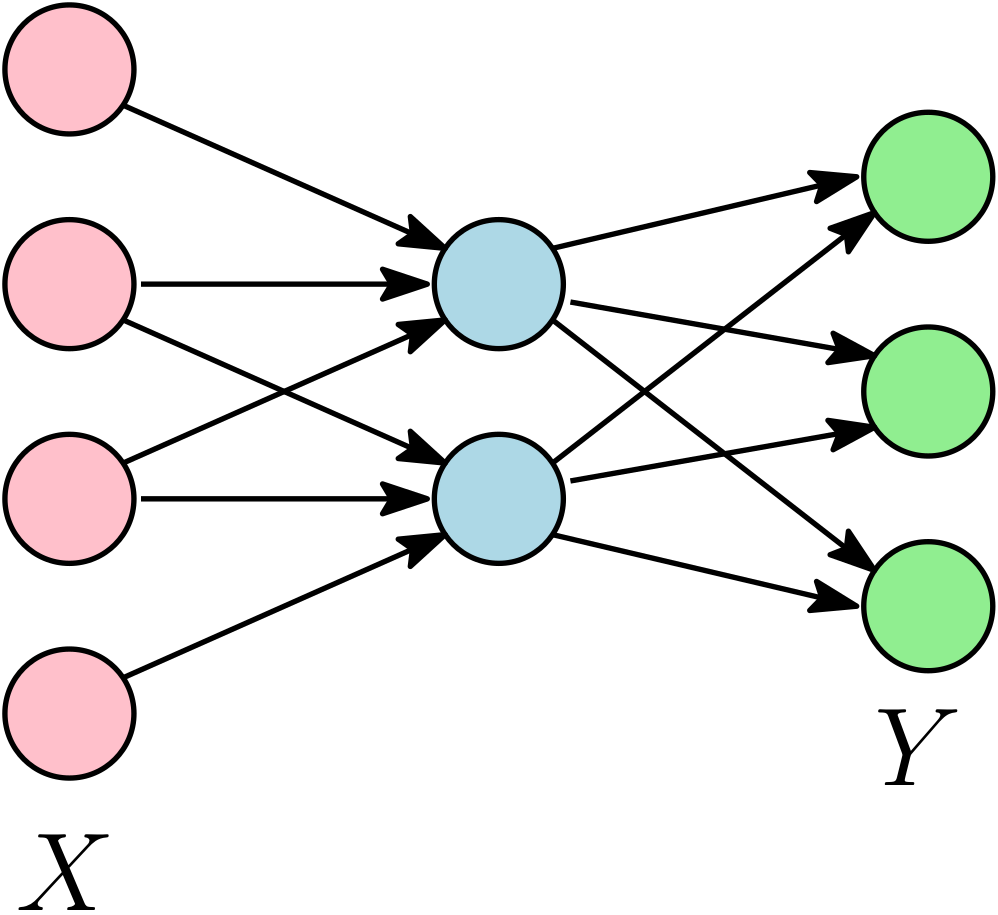We focus on linear neural networks, with a prediction function \(x \mapsto A_2^\top A_1^\top x\), where \(x \in \mathbb{R}^d\) is the input, \(A_1 \in \mathbb{R}^{d \times m}\) is the matrix of input weights, and \(A_2 \in \mathbb{R}^{m \times k}\) is the matrix of output weights, with an overall weight matrix \(\Theta = A_1 A_2 \in \mathbb{R}^{d \times k}\). This is a linear model corresponding to multi-task / multi-category classification / multi-label supervised problems, or an auto-encoder for unsupervised learning. Clearly, using the parameterization \(\Theta = A_1 A_2\) is not the most efficient for optimization (as we could simply use convex optimization directly on \(\Theta\)), but we use it for understanding non-convex dynamics.