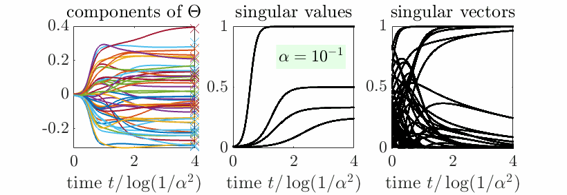Gradient descent on \((A_1,A_2)\): As seen above \(\displaystyle \theta = \frac{1}{ \frac{1}{\alpha^2} e^{-2ct} + \frac{s}{c} ( 1 – e^{-2ct} )}\). The singular values \(c\) of \(\frac{1}{n} X^\top Y\) characterize the dynamics, with each singular value appearing one by one when \(\alpha\) is small.