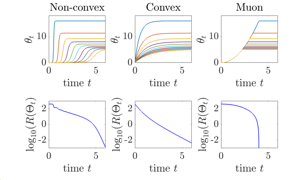 Muon: this is the new cool algorithm (“stylé” my kids would say). It corresponds to orthogonalizing the matrix updates, and thus, to do sign descent with vanishing step-size on the singular values, that is, \(\dot{a}_1 = \dot{a}_2 = 1\) until reaching the solution. This leads to \(\theta = \min \{ t^2, c/s\}\), with a conditioning that does not depend on \(s\) or \(c\). No singular values is impacting the dynamics, hence the “automatic” reconditioning, which extends what can be seen for sign descent (see previous post). Note that if we implement Muon directly on \(\Theta\), we would obtain instead \(\theta = \min \{ t, c/s\}\).