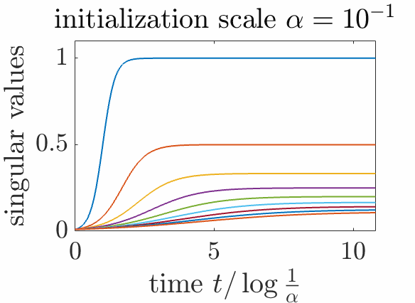 Insights. We see the sequential learning of each singular values when the initialization scale \(\alpha\) tends to zero, as then we have $$ \theta \sim \frac{1}{ \frac{1}{\alpha^2} e^{-2ct} + \frac{s}{c}},$$ with a sharp jump from \(0\) to \(\frac{c}{s}\), around the time \(\frac{1}{c} \log \frac{1}{\alpha}\).